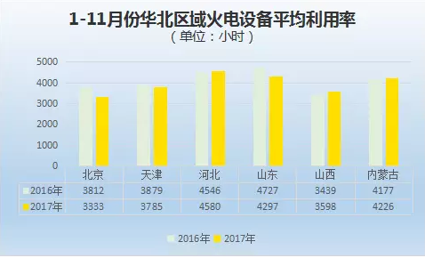 2017年1-11月華北區(qū)域北京、天津、山東火電設(shè)備平均利用小時數(shù)分別為3333小時、3785小時、4297小時,與上年同期相比,下降479小時、94小時、430小時。河北、山西、內(nèi)蒙古與上年同期相比,有小幅度增長,分別為4580小時、3598小時、4226小時。