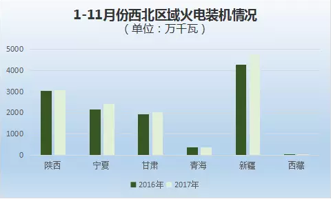 基于自身的資源優(yōu)勢,西北區(qū)域也是我國火電裝機(jī)較為集中的區(qū)域。2017年1-11月份新疆、陜西、寧夏、甘肅、青海、西藏火電裝機(jī)容量分別為4763萬千瓦、3064萬千瓦、2432萬千瓦、2024萬千瓦、378萬千瓦、39萬千瓦,其中新疆較上年同期增長了11.7%,其他省份增幅較小。