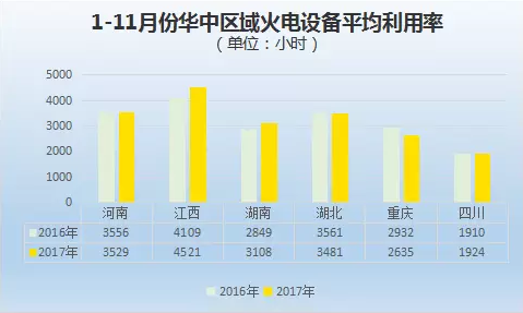 2017年1-11月華中區(qū)域江西、河南、湖北、湖南、重慶、四川火電設(shè)備平均利用小時(shí)數(shù)分別為4521小時(shí)、3529小時(shí)、3481小時(shí)、3108小時(shí)、2635小時(shí)、1924小時(shí)。除江西、湖南外,其他地區(qū)火電設(shè)備平均利用小時(shí)數(shù)都出現(xiàn)了下滑。