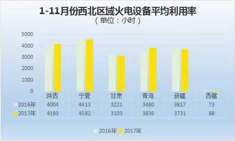 2017年1-11月份寧夏、陜西、青海、西藏火電設(shè)備平均利用小時(shí)數(shù)高于上年同期水平,分別為4582小時(shí)、4193小時(shí)、3836小時(shí)、88小時(shí)。甘肅、新疆的火電設(shè)備平均利用小時(shí)數(shù)與上年同期相比出現(xiàn)下滑,分別為3103小時(shí)、3731小時(shí),下滑了118小時(shí)、86小時(shí)。