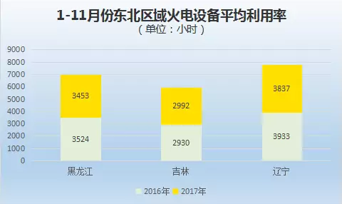 黑龍江、吉林、遼寧2017年1-11月份火電設(shè)備平均利用小時(shí)數(shù)分別為3453小時(shí)、2992小時(shí)、3837小時(shí),與上年同期相比,僅吉林出現(xiàn)小幅上升,黑龍江、遼寧均出現(xiàn)71小時(shí)、96小時(shí)的下滑。