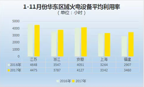 華東區(qū)域是我國用電較為集中的區(qū)域,2017年1-11月份華東區(qū)域火電設(shè)備平均利用小時(shí)數(shù)除江蘇外,整體小幅度上升。江蘇、安徽、浙江、福建、上?;痣娫O(shè)備平均利用小時(shí)數(shù)分別為4475小時(shí)、4127小時(shí)、3787小時(shí)、3460小時(shí)、3342小時(shí)。