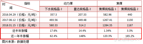 我們看一下就具體煤種價(jià)格情況,根據(jù)中國(guó)太原煤炭交易中心的數(shù)據(jù),截止2018年1月15日,動(dòng)力煤以及焦煤的價(jià)格半年來均有所上漲,其中動(dòng)力煤的價(jià)格漲幅較大,比如動(dòng)力煤品種的下水規(guī)格品2價(jià)格為580.33元/噸,近半年時(shí)間漲了17.6%。如果將時(shí)間上延至2016年4月份,兩種煤炭?jī)r(jià)格的漲幅均非常驚人。
