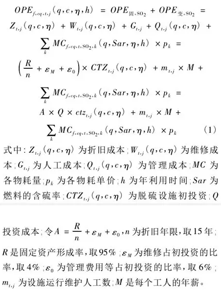 燃煤電廠煙氣脫硫系統(tǒng)運行成本包括固定成本和變動成本兩部分。固定成本OPE固,SO2通常包括折舊成本、維修成本、人工成本和管理成本,變動成本OPE變, SO2即脫硫技術(shù)的物耗量,與爐型f,煤質(zhì)cq、控制技術(shù)t、機組容量q、污染物入口濃度c、脫除效率η以及年利用小時數(shù)h有關(guān)。煙氣脫硫運行成本計算公式見式(1):