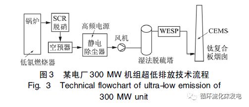 該電廠于2014年初啟動(dòng)1號(hào)機(jī)組“超潔凈排放”改造工作,3—7月實(shí)施了機(jī)組“超潔凈排放”改造工程,2014年7月21日1號(hào)機(jī)組大修后投入運(yùn)行。“超潔凈排放”改造主要工作有脫硫增容改造、高頻電源改造、WESP改造、脫硝空預(yù)器改造、脫硝流場(chǎng)及噴氨優(yōu)化、脫硝催化劑單元加裝、鈦復(fù)合板煙囪改造、排放連續(xù)監(jiān)測(cè)系統(tǒng)(continuousEmissionmonitoringsystem,CEMS)改造等工作,同時(shí)進(jìn)行了原有環(huán)保設(shè)施的大修,確保1號(hào)機(jī)組大修啟機(jī)后實(shí)現(xiàn)煙氣污染物的超潔凈排放。圖3為某電廠300MW機(jī)組超低排放技術(shù)流程總覽。