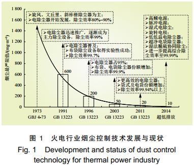 自 GB 13223—1996 標準頒布實施后,電力工業(yè)原先普遍應用的旋風除塵器、文丘里水膜除塵器、斜棒柵除塵器等,因其除塵效率低,無法達到排放標準而遭到淘汰,取而代之的是高效電除塵器,從此電除塵技術得到普及。 “ 十一五”至“十二五” 期間,中國燃煤電廠煙塵排放限值經(jīng)歷了從 50 mg/m3 到 30 mg/m3 再到 10 mg/m3 的三級跳,電除塵技術方面高頻電源、脈沖電源、旋轉電極、低低溫電除塵、濕式電除塵等新技術應運而生并得到大規(guī)模應用,同時電袋復合除塵和袋式除塵技術不斷取得突破,相應裝機容量份額逐漸提高,另外濕法脫硫協(xié)同除塵技術和效果也逐步提高[15]??梢姡S著火電行業(yè)大氣污染物排放標準的日益嚴格,能夠長期保證低濃度排放的先進除塵技術進入了快速規(guī)模化應用時期,而國外除塵新技術研究與應用處于相對停滯狀態(tài)。隨著中國火電廠煙塵排放標準日益趨嚴,中國火電行業(yè)除塵技術發(fā)展情況如圖 1 所示。