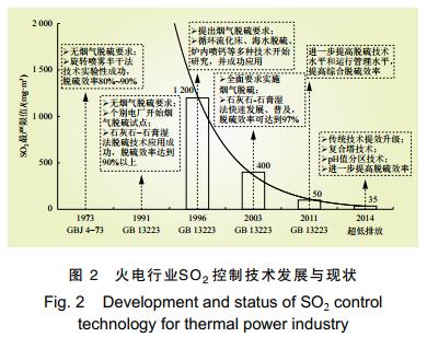隨著發(fā)改能源[2014]2093 號文及各地方超低排放要求的相繼出臺,脫硫技術的發(fā)展步入了超低排放階段,國內在引進消化吸收及自主創(chuàng)新的基礎上形成了多種新型高效脫硫工藝,如石灰石-石膏法的傳統(tǒng)空塔噴淋提效技術、復合塔技術(包括旋匯耦合、沸騰泡沫、旋流鼓泡、雙托盤、湍流 管 柵 等 ) 和 p H 值 分 區(qū) 技 術 ( 包 括 單 塔 雙pH 值、雙塔雙 pH 值、單塔雙區(qū)等) [15]。隨著中國火電廠 SO2 排放標準日益趨嚴,中國火電行業(yè)脫硫技術發(fā)展情況如圖 2 所示。