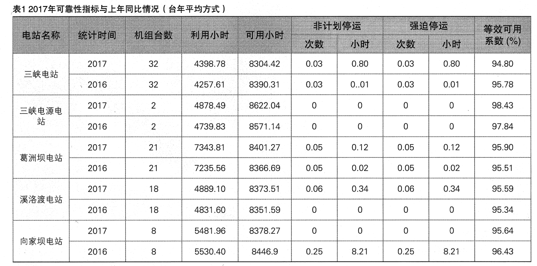 長江電力通過合理安排電站運(yùn)行方式,加強(qiáng)對(duì)設(shè)備運(yùn)行期間的運(yùn)行監(jiān)測(cè)、診斷分析,及時(shí)發(fā)現(xiàn)處理設(shè)備缺陷及隱患,保證機(jī)組安全穩(wěn)定運(yùn)行。針對(duì)電力生產(chǎn)過程中暴露出的典型缺陷和重點(diǎn)問題,公司高度重視,及時(shí)提出應(yīng)對(duì)措施,提出技術(shù)改造方案并組織實(shí)施。因運(yùn)行調(diào)度合理、設(shè)備運(yùn)行維護(hù)良好,各電站的可靠性指標(biāo)保持較高水平,主要指標(biāo)(臺(tái)年平均方式)見表1。