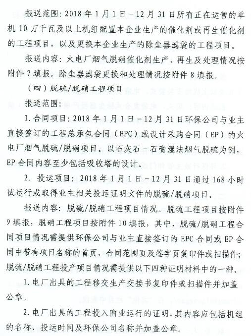 報送內(nèi)容:脫硫/脫硝工程項目情況。脫硫工程項目按附件9填報,脫硝工程項目按附件10填報,其中,脫硫/脫硝工程合同項目情況需提供環(huán)保公司與業(yè)主直接簽訂的EPC合同或EP合同中帶有項目名稱的首頁、合同范圍頁及簽字頁復(fù)印件或掃描件;脫硫/脫硝工程投產(chǎn)項目情況需提供以下四種證明材料中的一種。