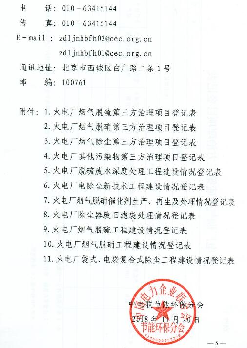 中國電力企業(yè)聯(lián)合會已連續(xù)13年組織開展了火電廠環(huán)保產(chǎn)業(yè)登記工作,并相繼公布了2005-2017年環(huán)保裝置建設(shè)情況及環(huán)保公司業(yè)績排序等信息,促進(jìn)了火電環(huán)保產(chǎn)業(yè)的健康發(fā)展。為全面反映2018年度火電廠環(huán)保產(chǎn)業(yè)發(fā)展情況,請你單位按要求認(rèn)真組織報送火電廠煙氣脫硫、脫硝、除塵及污染物第三方治理相關(guān)情況,于2019年1月10日前將有關(guān)材料報送我會。報送單位須對報送材料的真實性負(fù)責(zé),如有因材料不真實帶來的不良后果,由報送單位自行負(fù)責(zé)。具體事項通知如下: