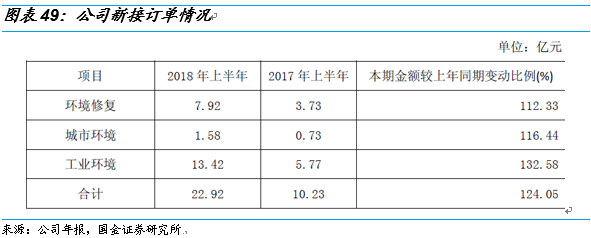 今年以來,公司項目拓展速度明顯加速,上半年公司三大業(yè)務(wù)板塊環(huán)境修復(fù)、城市環(huán)境和工業(yè)環(huán)境的新增訂單增速分別是112%、116%和133%,總金額達到了22.92億元。18年上半年,公司環(huán)境修復(fù)板塊實現(xiàn)收入4.28億元,同比增長64.29%。