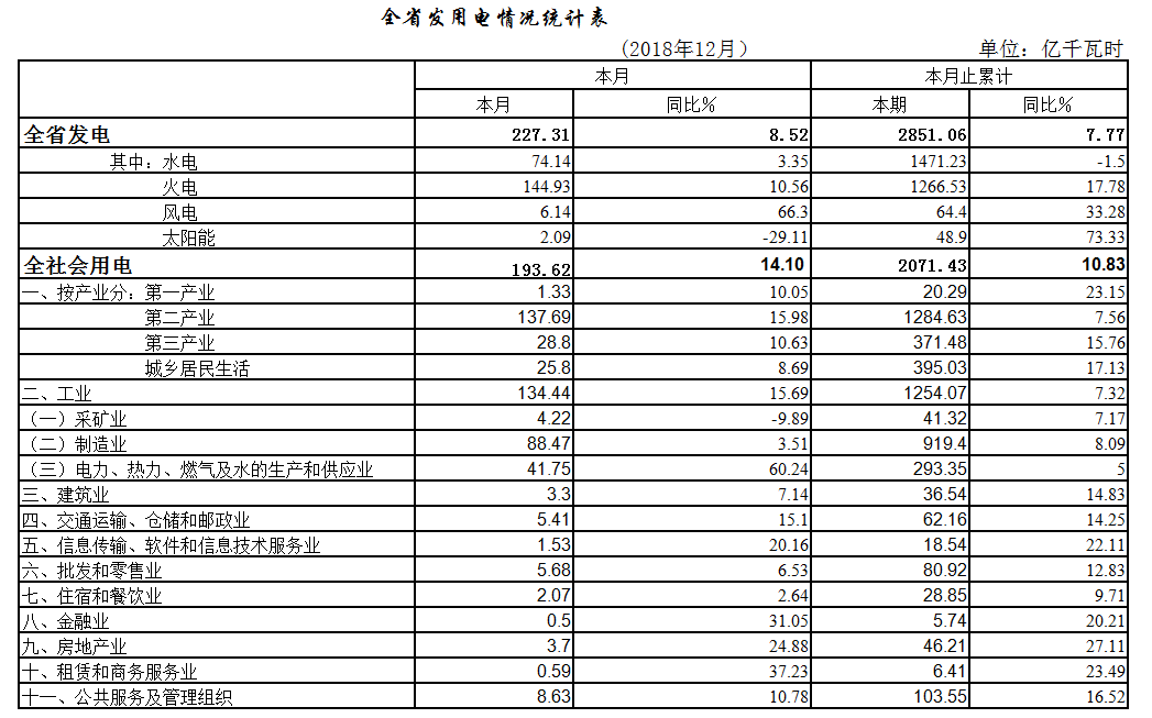 (二)全社會用電快速增長,各大產(chǎn)業(yè)和城鄉(xiāng)居民生活用電均作出不同貢獻。2018年全社會累計用電2071.43億千瓦時,其中,第一產(chǎn)業(yè)用電20.29億千瓦時,增長23.15%;第二產(chǎn)業(yè)用電1284.63億千瓦時,增長7.56%;第三產(chǎn)業(yè)用電371.48億千瓦時,增長15.76%;城鄉(xiāng)居民生活用電395.03億千瓦時,增長17.13%。各大產(chǎn)業(yè)對全社會用電的增長均作出不同貢獻,2018年全社會同比新增用電202.43億千瓦時,其中第一、二、三產(chǎn)業(yè)分別同比新增用電3.81億千瓦時、90.29億千瓦時、50.57億千瓦時,對全社會用電增長的貢獻率分別為1.88%、44.60%、24.98%;城鄉(xiāng)居民生活同比新增用電57.76億千瓦時,對全社會用電增長的貢獻率為28.53%。