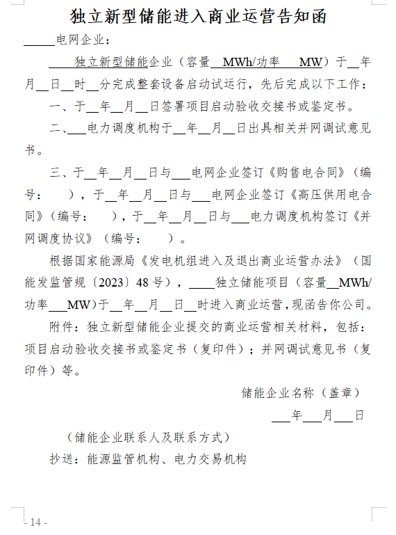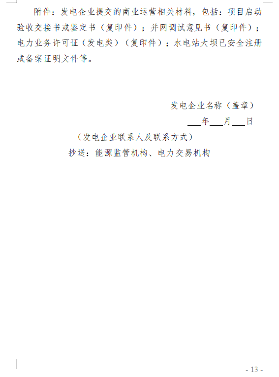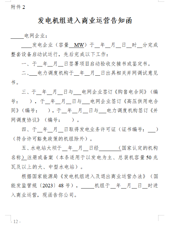 第十一條 在完成整套設(shè)備啟動試運行后3個月內(nèi)(風電、光伏發(fā)電項目在并網(wǎng)后6個月內(nèi)),擁有發(fā)電機組、獨立新型儲能的市場主體分別具備第八條、第九條商業(yè)運營條件后,以正式文件將進入商業(yè)運營情況(附件2格式)及相關(guān)材料報送電網(wǎng)企業(yè),從完成整套設(shè)備啟動試運行時間點起自動進入商業(yè)運營。