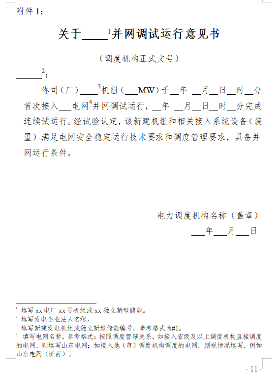 第六條 電力調(diào)度機構(gòu)應(yīng)建立并公開發(fā)電機組和獨立新型儲能并網(wǎng)調(diào)試有關(guān)工作制度或業(yè)務(wù)指導(dǎo)書,明確辦理并網(wǎng)調(diào)試業(yè)務(wù)的有關(guān)工作部門、工作流程、工作時限、需要提交的材料清單及技術(shù)要求等。電力調(diào)度機構(gòu)按附件1格式出具并網(wǎng)調(diào)試運行意見書。