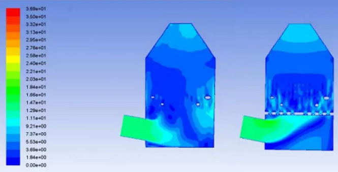 (有無湍流器的吸收塔內(nèi)速度分布對比,左邊是無湍流器,右邊是有湍流器)