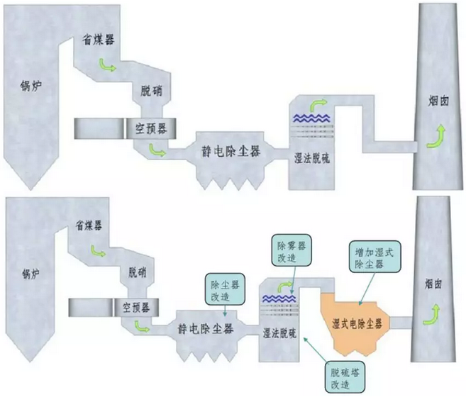 (上圖為傳統(tǒng)的燃煤電廠煙氣治理裝置;下圖為欲達(dá)到超低排放標(biāo)準(zhǔn)的常規(guī)改造方案)