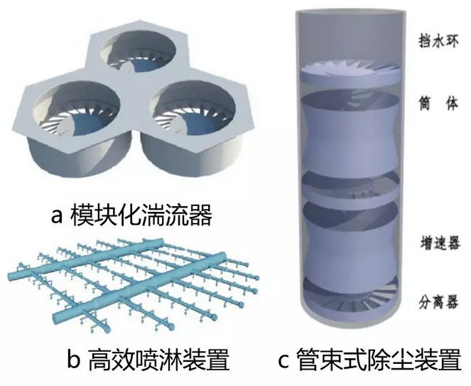 SPC-3D的三大技術(shù)核心包括旋匯耦合高效脫硫除塵技術(shù)、高效節(jié)能噴淋技術(shù)和離心式管束式除塵技術(shù),它們在吸收塔內(nèi)從下至上分布。