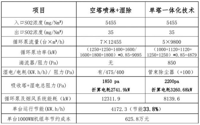 (以1000MW機(jī)組為例,采用單塔一體化技術(shù)和常規(guī)的空塔噴淋加濕除能耗對比)