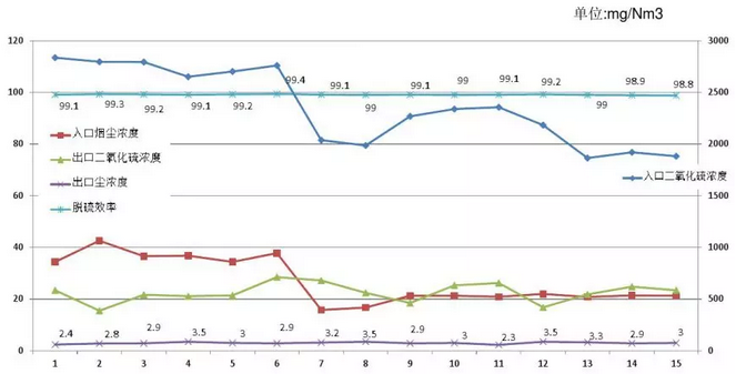 以某300MW電廠為例,可以看出運(yùn)行過程中脫硫效率不低于98.8%;當(dāng)吸收塔入口處煙塵濃度在50mg/Nm3以內(nèi)時,出口煙塵濃度可以持續(xù)保持≤5 mg/Nm3。
