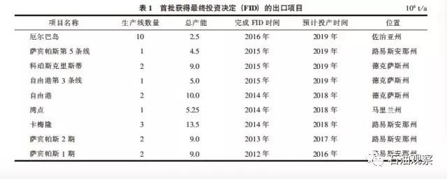2016年2月24日,薩賓帕斯項目成功出口美國本土48個州的第一船LNG資源。首批獲得最終投資決定(FID)的9個出口項目,包括SabinePass(薩賓帕斯)、Cameron(卡梅隆)、Freeport(自由港)、CorpusChristi(科珀斯克里斯蒂)和ElbaIsland(厄爾巴島)等,詳見表1。這些項目計劃于2017—2019年集中投產(chǎn),名義產(chǎn)能達(dá)到6775萬t/a。