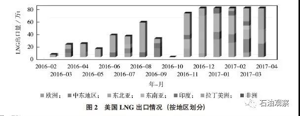 目前,SabinePass(薩賓帕斯)項目已經(jīng)向20余個國家成功出口了至少100船LNG資源,覆蓋全球60%以上的LNG需求國家和地區(qū),包括埃及、約旦、巴基斯坦等新興買家。 SabinePass(薩賓帕斯)項目的前5條生產(chǎn)線大部分已通過簽訂長期FOB采購合同售出,買家包括BG(2016年被殼牌收購)、GNF、Kogas、GAIL、Total、Centrica等公司。預(yù)計2017年SabinePass(薩賓帕斯)正在運營及計劃投產(chǎn)的生產(chǎn)線將達(dá)到滿負(fù)荷生產(chǎn)能力(1800萬t/a)。美國LNG出口情況詳見圖2。