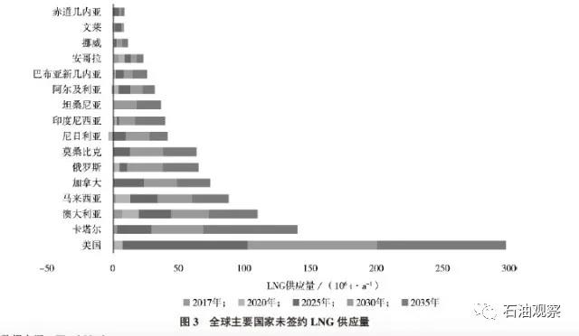 根據(jù)殼牌2017年LNG前景報告預(yù)測,2014年到2020年全球LNG貿(mào)易規(guī)模將增長50%。其中近1/3的新增供應(yīng)將來自美國。預(yù)計從2020年開始,美國仍有大量未簽約LNG供應(yīng)量,在目前遞交審批的項目中,像GoldenPass、PortArthur等項目分別由??松梨?、卡塔爾石油公司、Sempra、Woodside等公司投資,盡管采購協(xié)議還沒有落實,但這些公司可以通過自身的資源池來消化部分供應(yīng)量,因此這些項目獲審批可能性較高。此外,包括SabinePass(薩賓帕斯)、Cameron(卡梅隆)、Freeport(自由港)、CorpusChristi(科珀斯克里斯蒂)等擴建的生產(chǎn)線由于具有更短的建設(shè)周期、更低的人工與建設(shè)成本和更多積累的運營經(jīng)驗,將比諸多新建項目更具備經(jīng)濟(jì)性,更容易通過審批。全球主要國家未簽約的LNG供應(yīng)量情況見圖3。