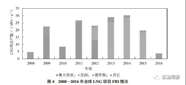 自2011年日本福島事件之后,全球LNG市場開始不斷加大對市場供不應(yīng)求的預(yù)期,每年做FID的項目液化能力平均達(dá)到2500萬t,并于2014年達(dá)到峰值。其中2009—2012年高油價時期FID的項目主要集中在澳大利亞,但在當(dāng)時,與澳大利亞出口項目掛鉤傳統(tǒng)油價的計價方式相比,美國LNG項目憑借較低的天然氣成本價加液化費用和運輸成本的計價方式顯得頗具吸引力。