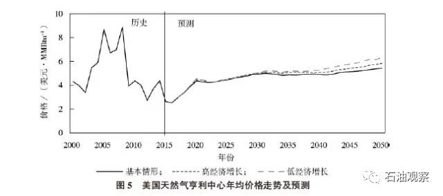 液化服務(wù)費水平在2.25~3.5美元/MMBtu之間,假設(shè)美國至亞洲的運輸成本按1.5~2.0美元/MMBtu測算。原料氣價格方面,受頁巖氣等非常規(guī)氣大力開發(fā)和生產(chǎn)的影響,HenryHub氣價自2008年以來開始暴跌。雖然2010年和2012年稍有回彈,但2014年起繼續(xù)下跌,2016年3月一度跌至歷史最低水平(1.73美元/MMBtu),目前仍維持在3美元/MMBtu左右。據(jù)統(tǒng)計,美國有超過22萬億m3的天然氣資源成本低于3美元/MMBtu。因此,長期來看,得益于美國豐富的天然氣儲量和不斷發(fā)展的開采技術(shù),天然氣價格將進(jìn)入緩慢增長通道。EIA預(yù)測了基本情形、高經(jīng)濟(jì)增長和低經(jīng)濟(jì)增長三種背景下HenryHub氣價的未來走勢,詳見圖5。從圖5可以看出,HenryHub氣價預(yù)計在未來30年左右將在4~6美元/MMBtu之間。