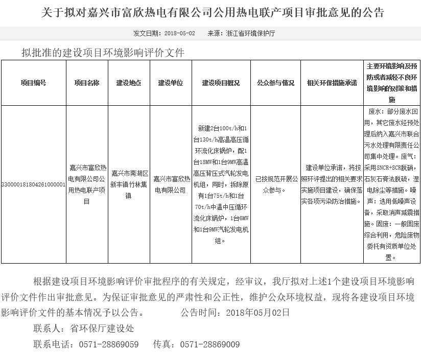 浙江省環(huán)保廳擬審批嘉興市富欣熱電有限公司公用熱電聯(lián)產(chǎn)項目