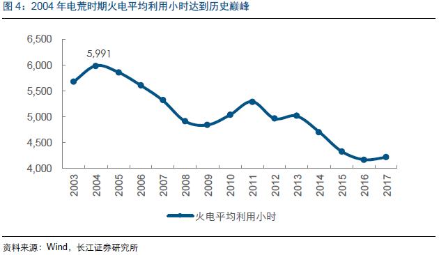 由于供給與需求不匹配,火力發(fā)電平均利用小時(shí)在“電荒”時(shí)期達(dá)到峰值,單位機(jī)組出力度較高。2004 年,火力發(fā)電機(jī)組平均利用小時(shí)達(dá)到5991 小時(shí)。