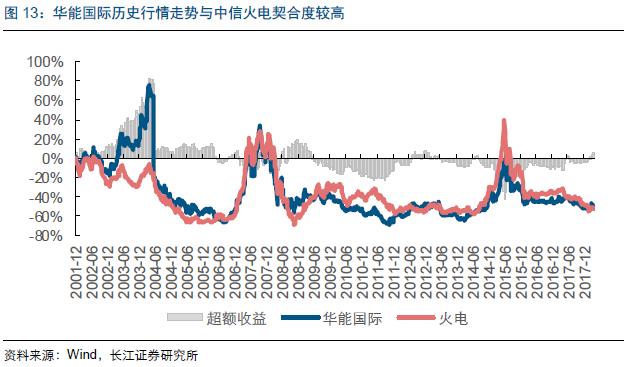 通過(guò)進(jìn)一步對(duì)比公司股價(jià)與火電行業(yè)指數(shù)的收益率,可以看到公司作為國(guó)內(nèi)毫無(wú)爭(zhēng)議的火電龍頭企業(yè),在不考慮分紅的情況下其行情波動(dòng)與行業(yè)整體走勢(shì)高度相關(guān)。從圖形中我們可以比較清晰地看到,以自上市以來(lái)的長(zhǎng)周期來(lái)看公司股價(jià)走勢(shì)基本與中信火電行業(yè)指數(shù)同時(shí)同向變動(dòng)。唯一的例外發(fā)生在公司剛上市不久的2003年至2014年上半年間,這段時(shí)間內(nèi)公司多次發(fā)生債轉(zhuǎn)股,一定程度上對(duì)于公司股價(jià)走勢(shì)產(chǎn)生影響。