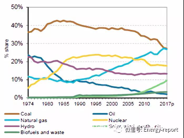 1974年~2017年經(jīng)合組織發(fā)電量,按來源劃分