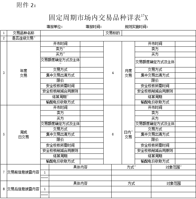 17.本表按周期性進(jìn)行交易的市場(chǎng)內(nèi)交易標(biāo)的品種填寫,一個(gè)交易品種填寫一張,例如直接交易、合同轉(zhuǎn)讓交易、調(diào)峰交易等。交易標(biāo)的主要指時(shí)標(biāo)電量、電量、輔助服務(wù)、合同約定電量(電力、輔助服務(wù))等。如有以年度交易方案等交易規(guī)則性質(zhì)文件的,則按年度填寫,每個(gè)年度方案對(duì)應(yīng)一張表。