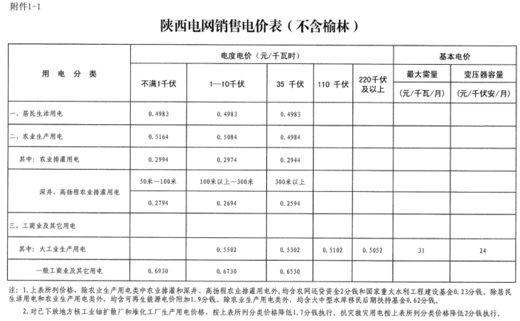 附件:1.陜西電網(wǎng)銷售電價(jià)表(不含榆林)