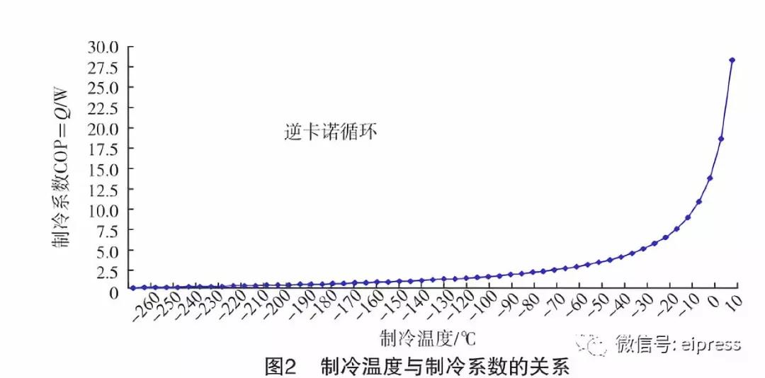 (1)隨著制冷溫度的不斷降低,單位制冷量的能量消耗急劇增加(見(jiàn)圖2),由此對(duì)如何高效制冷、冷量如何合理高效利用,以及設(shè)備的設(shè)計(jì)制造與操作運(yùn)行都提出了更高、更苛刻的要求。