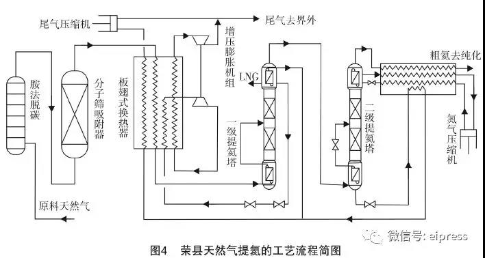 另外,通過(guò)“液化天然氣聯(lián)產(chǎn)提氦工藝技術(shù)”的研究,創(chuàng)新性提出了在天然氣提氦的同時(shí),副產(chǎn)部分LNG進(jìn)行冷量調(diào)節(jié),即避免天然氣低溫下重組分積聚對(duì)運(yùn)行穩(wěn)定性和冷量調(diào)節(jié)可操作性的不利影響,又能副產(chǎn)部分LNG產(chǎn)品,在一定程度上改善天然氣提氦的經(jīng)濟(jì)性。該技術(shù)已獲國(guó)家發(fā)明專利授權(quán),成功應(yīng)用于榮縣天然氣提氦裝置建設(shè),性能考核表明達(dá)到預(yù)期效果,其工藝流程簡(jiǎn)圖見(jiàn)圖4。