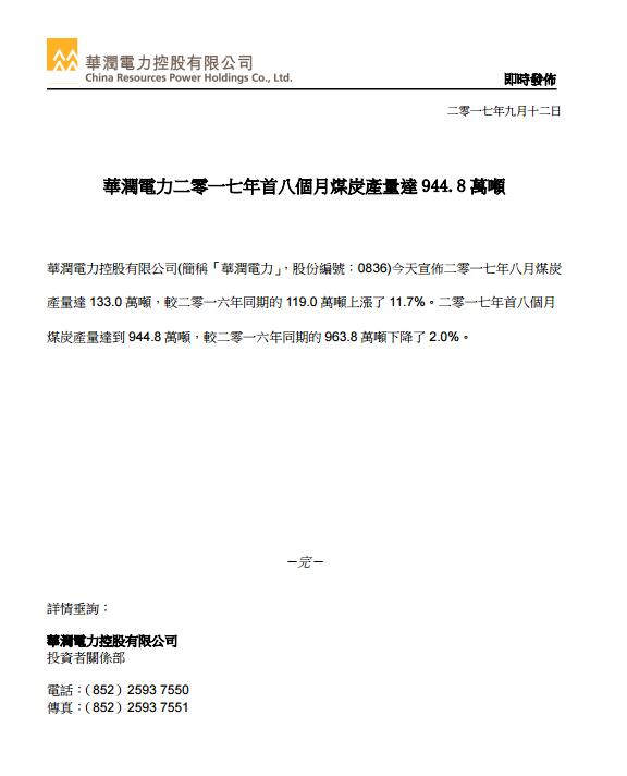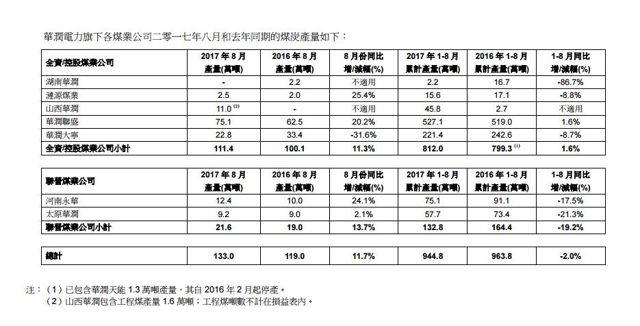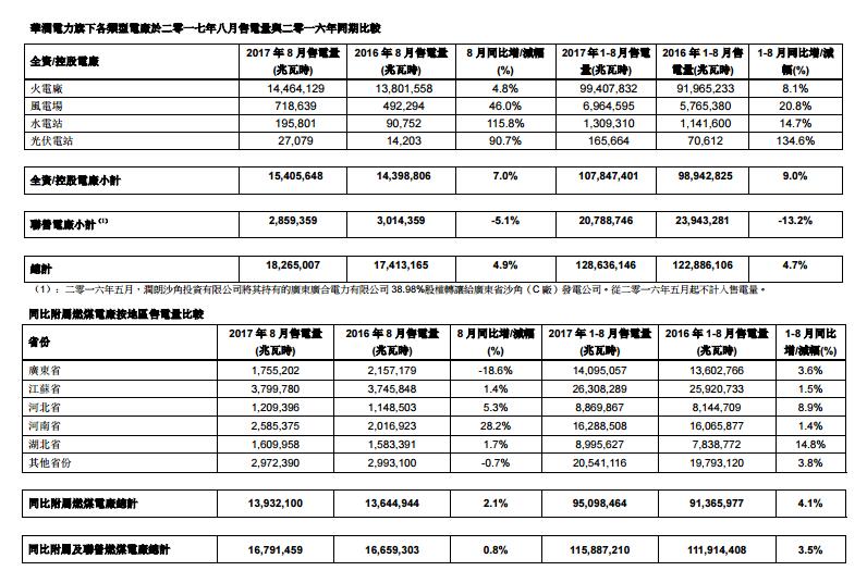 2017年首8個月附屬燃煤電廠同廠同口徑售電量同比增長4.1%。湖北省、河北省、廣東省、江蘇省、河南省及其他省份分別增長14.8%、8.9%、3.6%、1.5%、1.4%及3.8%。