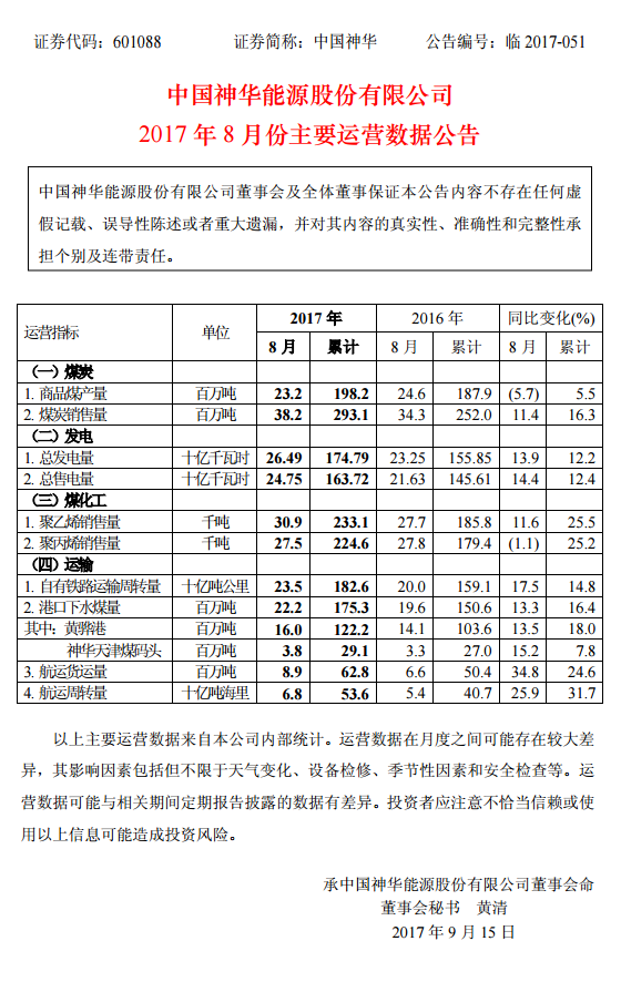 中國神華近日發(fā)布的2017年8月份主要運營數(shù)據(jù)公告顯示,8月份,中國神華發(fā)電量264.9億千瓦時,同比增長13.9%。2017年1-8月份,累計發(fā)電量1747.9億千瓦時,同比增長12.2%。