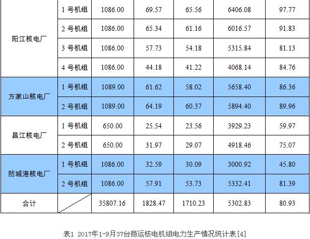說明:紅沿河核電廠2號(hào)機(jī)組1月初處于第2次換料大修期間,1月上旬至2月中旬應(yīng)電網(wǎng)要求臨停備用,3月中旬至4月下旬應(yīng)電網(wǎng)要求停機(jī),5月初至6月初應(yīng)電網(wǎng)要求停機(jī),6月中下旬至7月底應(yīng)電網(wǎng)要求降功率運(yùn)行;3號(hào)機(jī)組1月至2月上旬處于臨停檢修狀態(tài),2月上旬至4月中旬進(jìn)行了第1次換料大修,4月下旬至5月初應(yīng)電網(wǎng)要求進(jìn)入季節(jié)性停運(yùn)狀態(tài),6月中下旬至8月初應(yīng)電網(wǎng)要求降功率運(yùn)行;4號(hào)機(jī)組1月下旬至3月中旬應(yīng)電網(wǎng)要求臨停檢修,4月初至4月中旬應(yīng)電網(wǎng)要求降功率運(yùn)行,4月下旬至6月中旬進(jìn)行了專項(xiàng)檢修,6月下旬至7月底應(yīng)電網(wǎng)要求降功率運(yùn)行,隨后進(jìn)行季節(jié)性停運(yùn),截至9月底仍處于停運(yùn)狀態(tài)。寧德核電廠4號(hào)機(jī)組1月下旬至2月上旬應(yīng)電網(wǎng)要求調(diào)停,2月下旬至3月中旬應(yīng)電網(wǎng)要求降功率運(yùn)行,4月上旬應(yīng)電網(wǎng)要求停機(jī)備用,4月中旬應(yīng)電網(wǎng)要求降功率運(yùn)行,4月底至5月中旬應(yīng)電網(wǎng)要求降功率運(yùn)行,隨后因電網(wǎng)線路改造停機(jī)至6月底,8月下旬開始進(jìn)行第1次換料大修,截至9月底,大修仍在進(jìn)行。昌江核電廠1號(hào)機(jī)組1月中旬至3月下旬進(jìn)行了第1次換料大修,4月至9月大部分時(shí)間應(yīng)電網(wǎng)要求降功率運(yùn)行。防城港核電廠1號(hào)機(jī)組1月初至3月底進(jìn)行了第1次換料大修,4月底至5月上旬、5月底至6月初、7月初至7月下旬應(yīng)電網(wǎng)要求停機(jī)備用,4月中下旬、5月中下旬、6月下旬至7月初應(yīng)電網(wǎng)要求降功率運(yùn)行,7月下旬至8月中下旬應(yīng)電網(wǎng)要求降功率運(yùn)行,8月中下旬兩次應(yīng)電網(wǎng)要求周末臨停備用。因此,上述機(jī)組在1月至9月的核電設(shè)備平均利用率偏低。