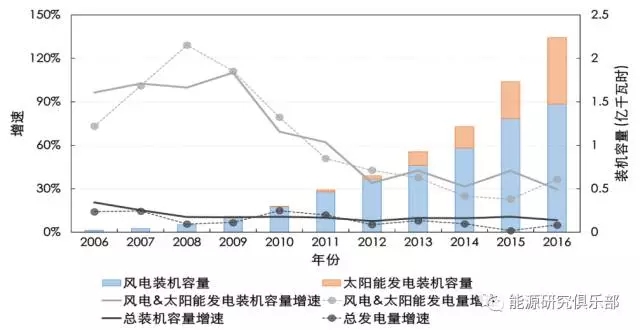 圖2 中國風(fēng)電、太陽能發(fā)電裝機(jī)及發(fā)電量增速情況