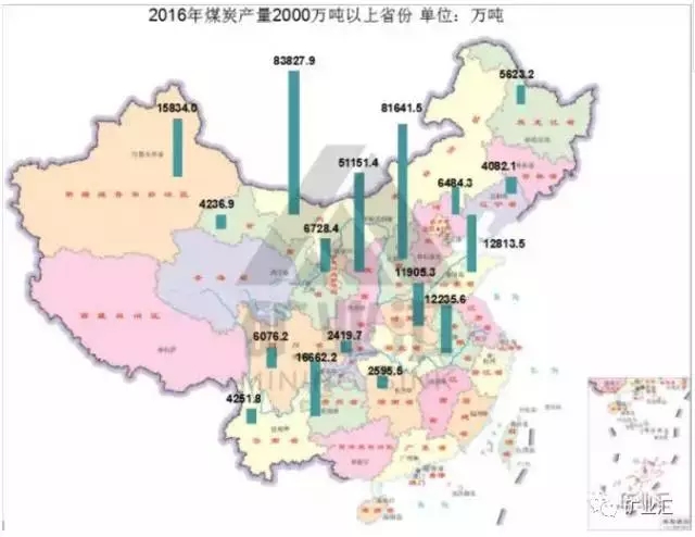 2016年我國煤炭產量為33.6億噸其中內蒙、山西、陜西三省產煤21.66億噸,占全國總產量的63%;內蒙、陜西、山西、黑龍江等北部省區(qū)共產煤247584.6萬噸,占全國的73%。