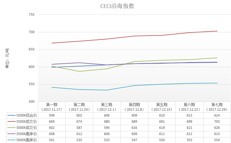 今日,中電聯(lián)公布中國沿海電煤采購價(jià)格指數(shù)(CECI沿海指數(shù))第7期數(shù)據(jù),本期數(shù)據(jù)相比上期均有不同程度的增長,現(xiàn)整理第1期至第7期數(shù)據(jù)如下:從中電聯(lián)公布數(shù)據(jù)來看,本期價(jià)格較上期價(jià)格增長1元 噸到5元 噸,從第三