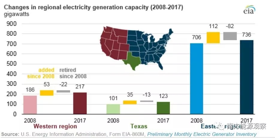 德州的裝機容量在三區(qū)中最少,至2017年10月,該地區(qū)總裝機達123GW。自2008年以來,德州的大部分退役的發(fā)電機都采用了燃氣蒸汽和石油發(fā)電技術(shù)。35%的燃氣發(fā)電機組和66%的石油發(fā)電機組退役;僅532MW的燃煤機組退役,占德州總裝機容量的2%。該州向EIA報告的發(fā)電機組退役計劃顯示,2018年德州預(yù)計將有5583MW的燃煤機組退役。
