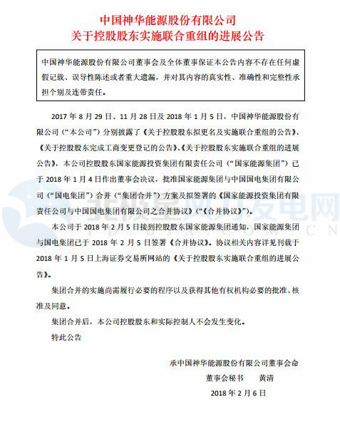 中國神華2月5日晚間發(fā)布公告,該公司于2018年2月5日接到控股股東國家能源集團通知,國家能源集團與國電集團已于2018年2月5日簽署合并協(xié)議,