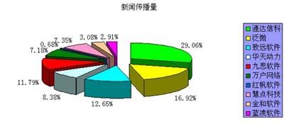 從網(wǎng)絡(luò)新聞傳播(以百度新聞搜索為參考)的角度來看,通達(dá)信科的傳播量最高,占前十強(qiáng)總量的29.06%,其次是泛微,新聞傳播量達(dá)16.92%,致遠(yuǎn)軟件以12.65%的占比次之。
