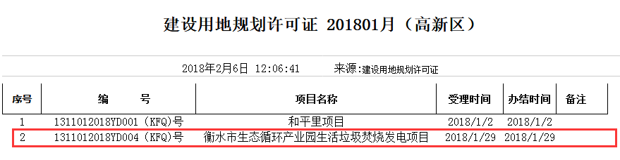 近日衡水市城鄉(xiāng)規(guī)劃局公示了最新的《建設用地規(guī)劃許可證201801月(高新區(qū))》,公示顯示衡水市生態(tài)循環(huán)產業(yè)園生活垃圾焚燒發(fā)電項目建設用地規(guī)劃許可證已于2018年1月29日辦結。
