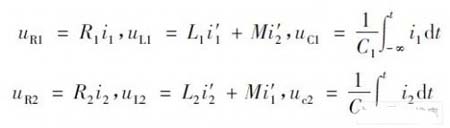 對于式(1),通過不同的處理將得到不同的數(shù)學(xué)模型。對圖1 所示的雙RLC 耦合回路進(jìn)行去耦處理,得到2 個獨(dú)立的RLC 串聯(lián)回路。對式(1)求導(dǎo),則可得到二元二階方程組: