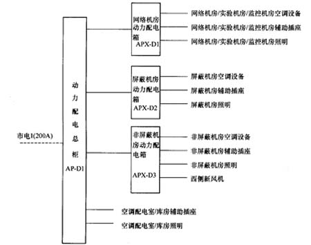 由總配電柜饋出的動力供配電系統(tǒng)采用50Hz交流電,380/220V三相五線電源,TN-S接地方式,零線和地線分開設(shè)置且零地線之間電壓小于1V。動力配電柜、照明配電箱采用放射式配電直接配至各用電設(shè)備,如下圖所示: