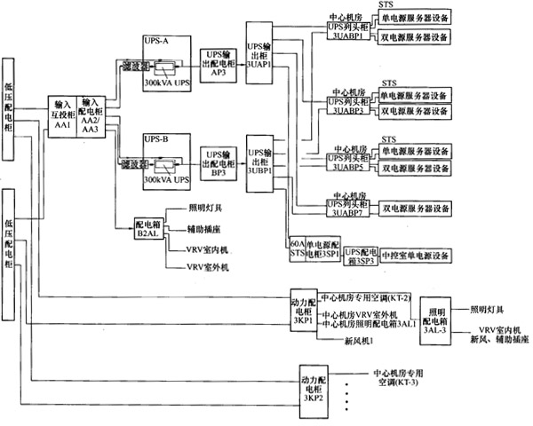 智能建筑中的機(jī)房用電,如計(jì)算機(jī)機(jī)房、數(shù)據(jù)中心、網(wǎng)絡(luò)機(jī)房、消防和安防控制室、電梯機(jī)房等用電,都屬于一級符合,要有確切的保障措施。有些數(shù)據(jù)傳輸系統(tǒng)是不允許斷電的,需UPS電源支持,否則,若發(fā)生斷電事故,會造成中達(dá)經(jīng)濟(jì)損失或數(shù)據(jù)丟失。因此,電源保障和供電可靠性在智能建筑的機(jī)房建設(shè)中顯得格外重要。