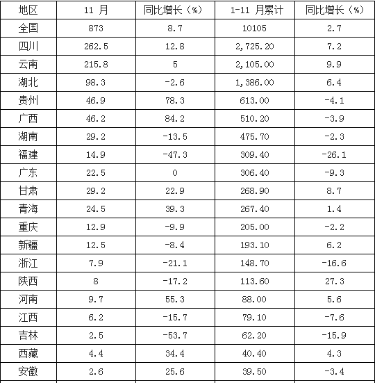 2017年11 月份,全國規(guī)模以上電廠水電發(fā)電量 873 億千瓦時,同比增長 8.7%。1-11月份,全國規(guī)模以上電廠水電發(fā)電量 10105億千瓦時,同比增長 2.7%,增速比上年同期回落 3.7 個百分點。全國水電發(fā)電量前三位的省份為四川(2725 億千瓦時)、云南(2105 億千瓦時)和湖北(1386 億千瓦時),其合計水電發(fā)電量占全國水電發(fā)電量的61.5%,同比分別增長 7.2%、 9.9%和 6.4%。